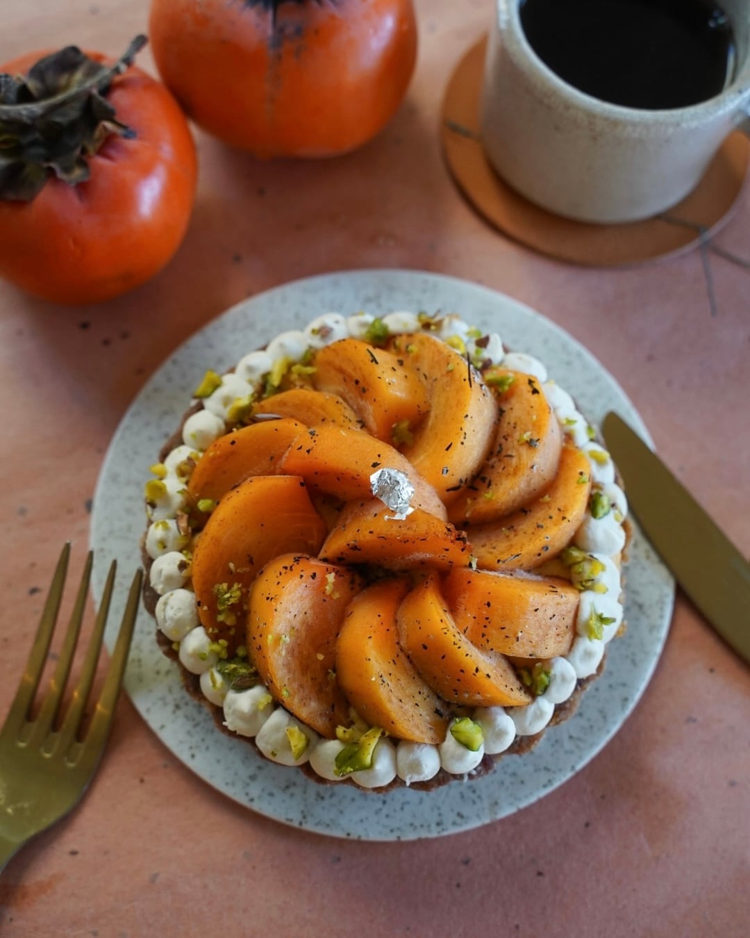土台は、カカオとスパイスをほのかに効かせたRAWタルト生地。みずみずしい柿とのコントラストが、驚くほど軽やかな余韻を生みます。