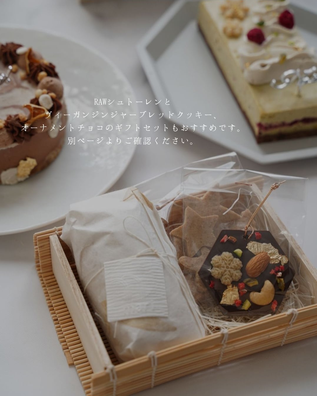 VEGANジンジャーブレッドクッキーやRAWチョコレートのオーナメントを添えれば、