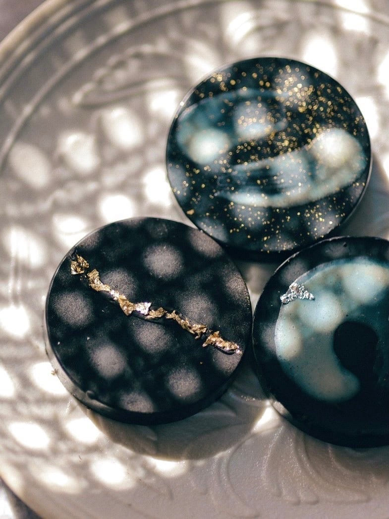 深の脱デジタル空間をイメージして、日本のスーパーフード、竹炭を使用した三種類のローチョコレートを考案しました。3つの模様はそれぞれ、金継ぎをイメージしたKintsugi、円相をイメージしたMaru、流星をイメージしたRyuseiで味わいも少しづつ異なります。