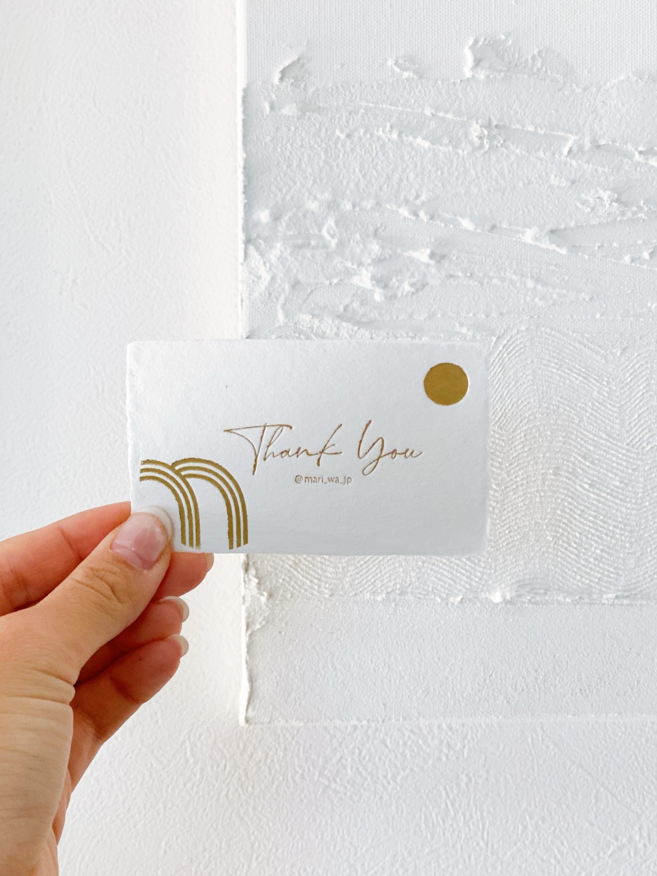 耳付きの越前和紙にmariオリジナルの模様とメッセージを箔押しした