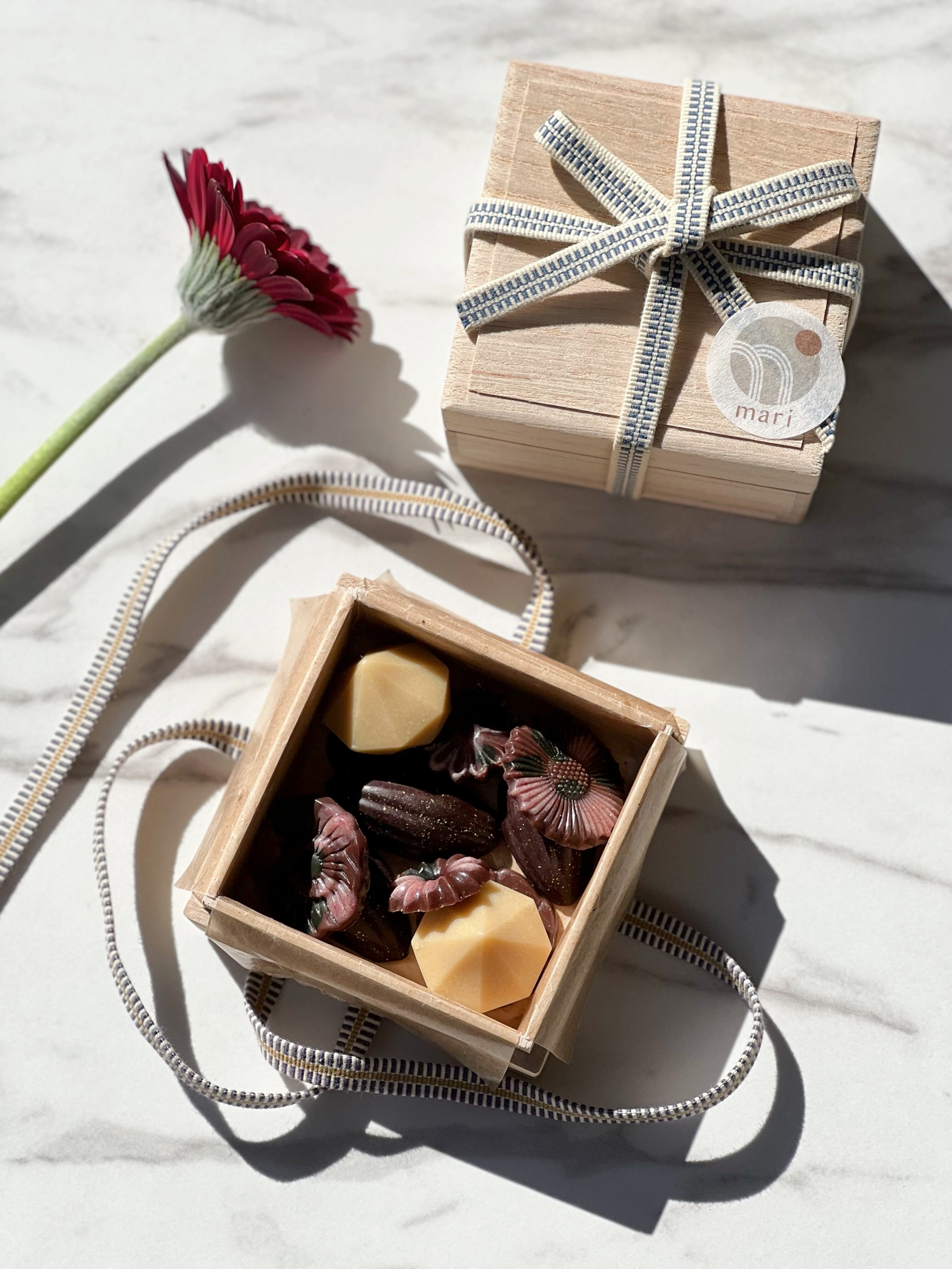 玉手箱のようにきらきらと輝く3種類のローチョコレートを詰め込みました。