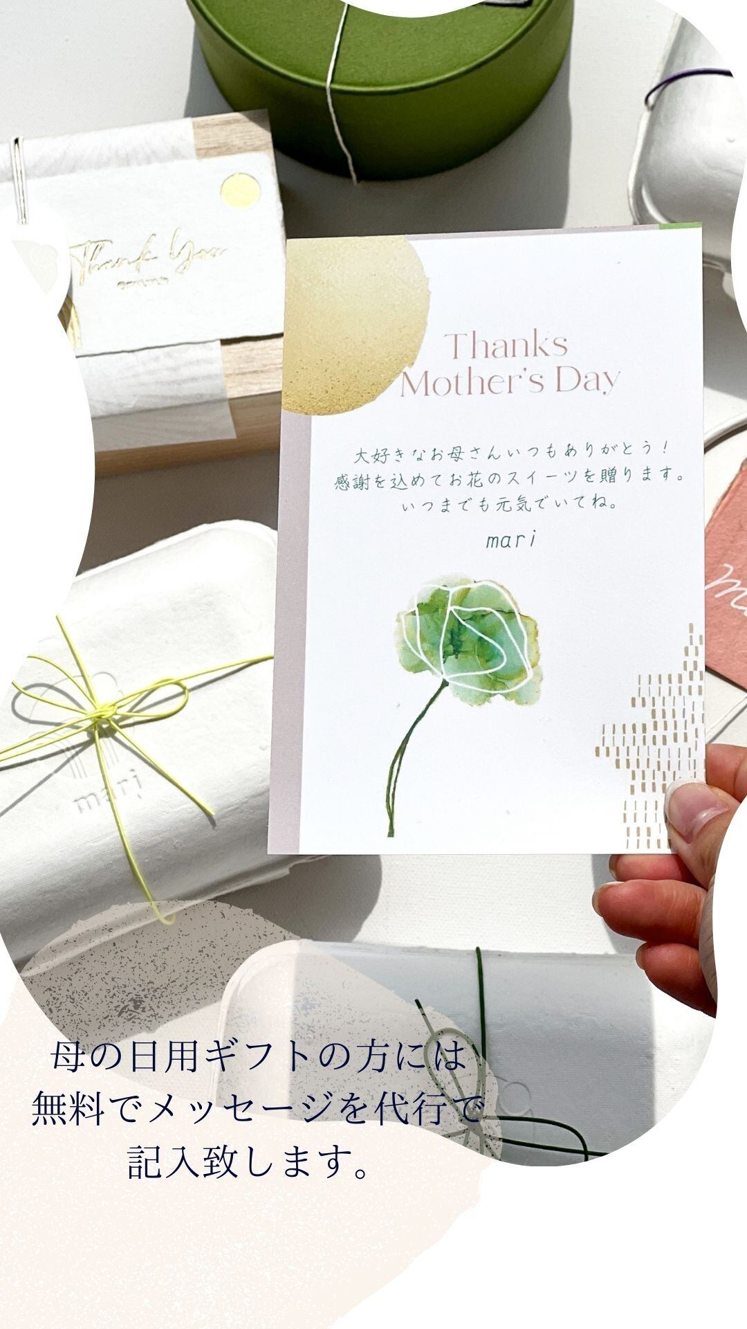 また、母の日用にご予約いただいた方には、代行メッセージサービスも無料で行っています。通常ダンボールに同封するポストカードをmariオリジナル母の日用ポストカードに変更、お好きなメッセージとお名前をお入れしてお届けします。ぜひ遠方にお住まいのお母様へのギフトにもご活用ください。