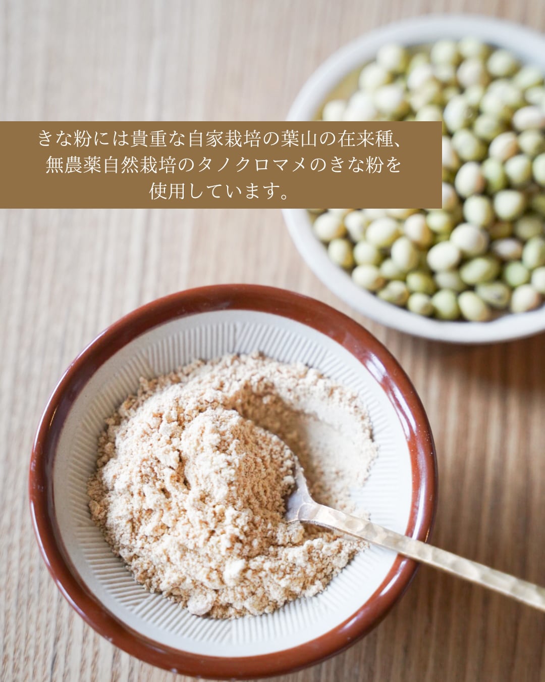 きなこは、自社農園の無農薬栽培で育てた葉山の貴重な在来種の大豆を炒って、きなこにしたものを使用。抹茶は京都産の有機宇治抹茶です。