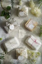 桐箱にお入れし、落水和紙にお包みします。すぐにお召し上がりいただけるよう黒文字の爪楊枝付き。ブランドロゴの入ったタグにはカモミールの種が漉き込んであり、水に浸けて植えるとカモミールが生えてきます。捨てずにご活用ください。