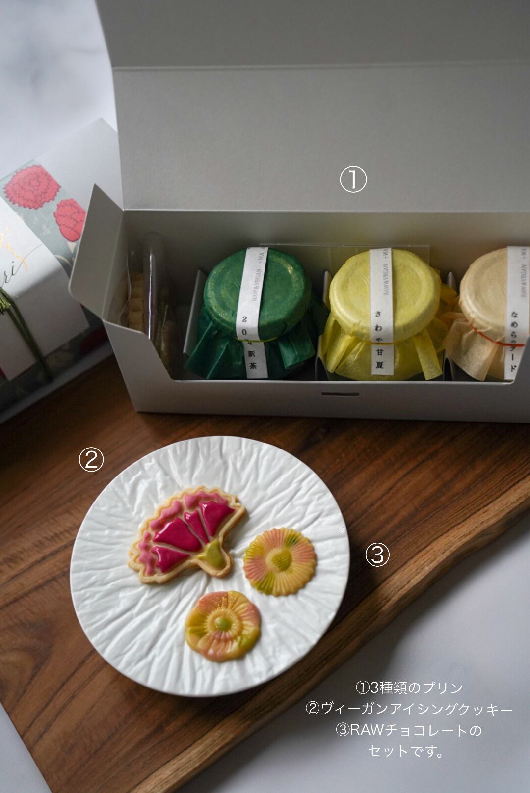内容量:①RAWプリン(100ml)×3個、②ヴィーガンアイシングクッキー×1個、③花型RAWチョコレート×2個